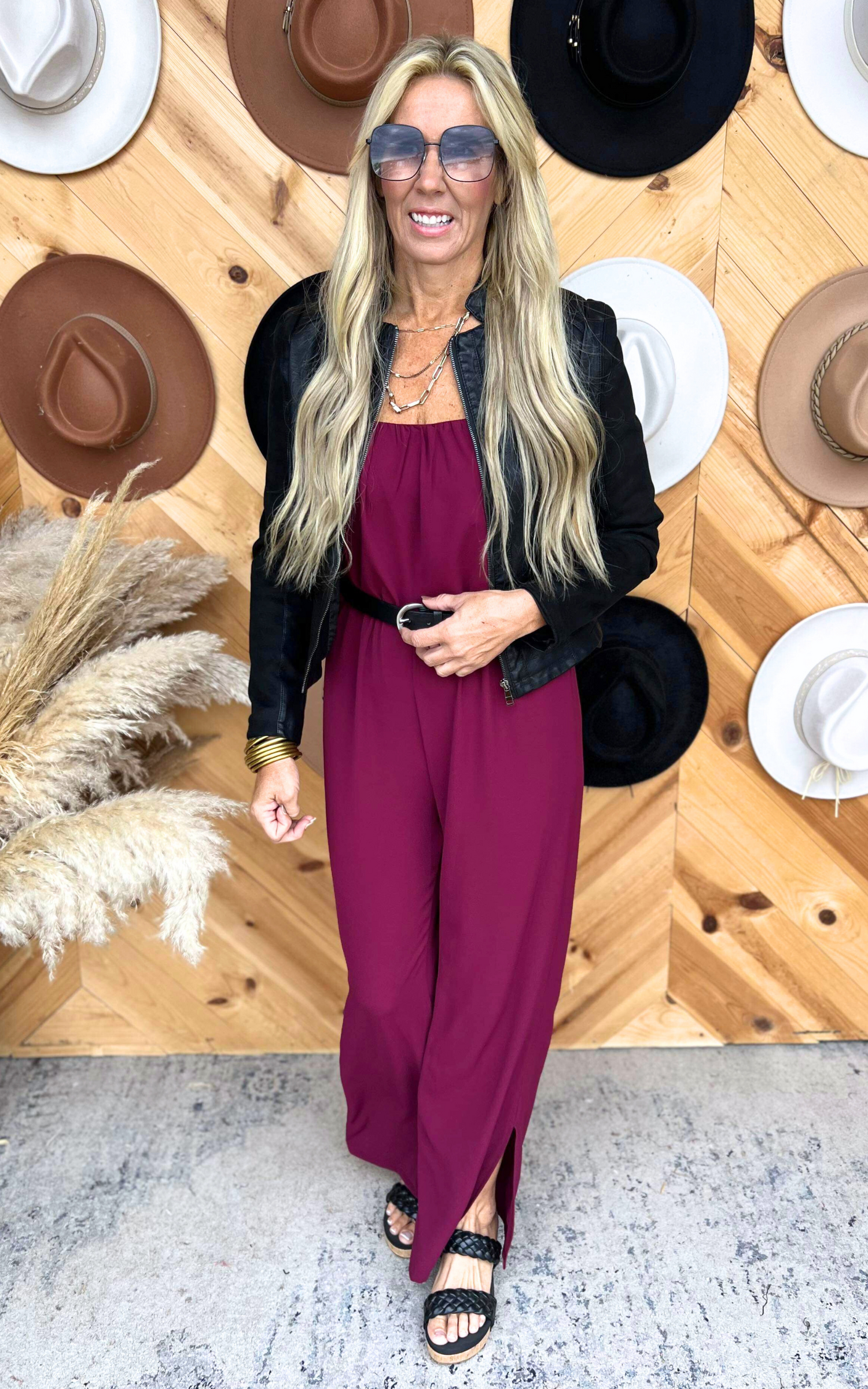 Textured Wine Tie Shoulder Ruched Jumpsuit - Final Sale