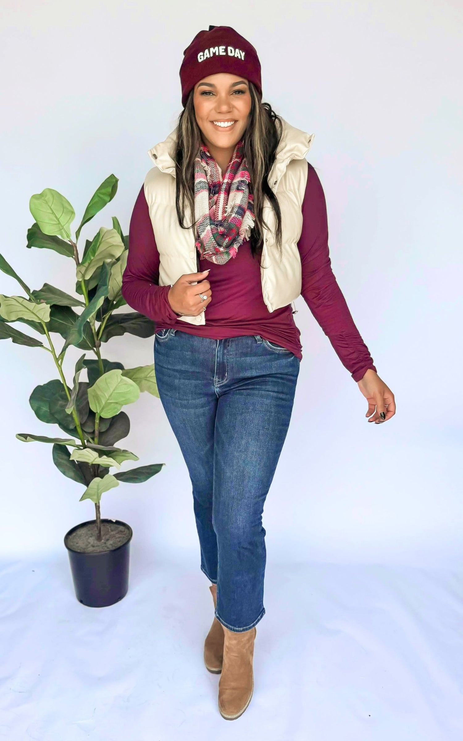 - Our Model, KONA (brunette), wears a size LARGE and would stick with her size.