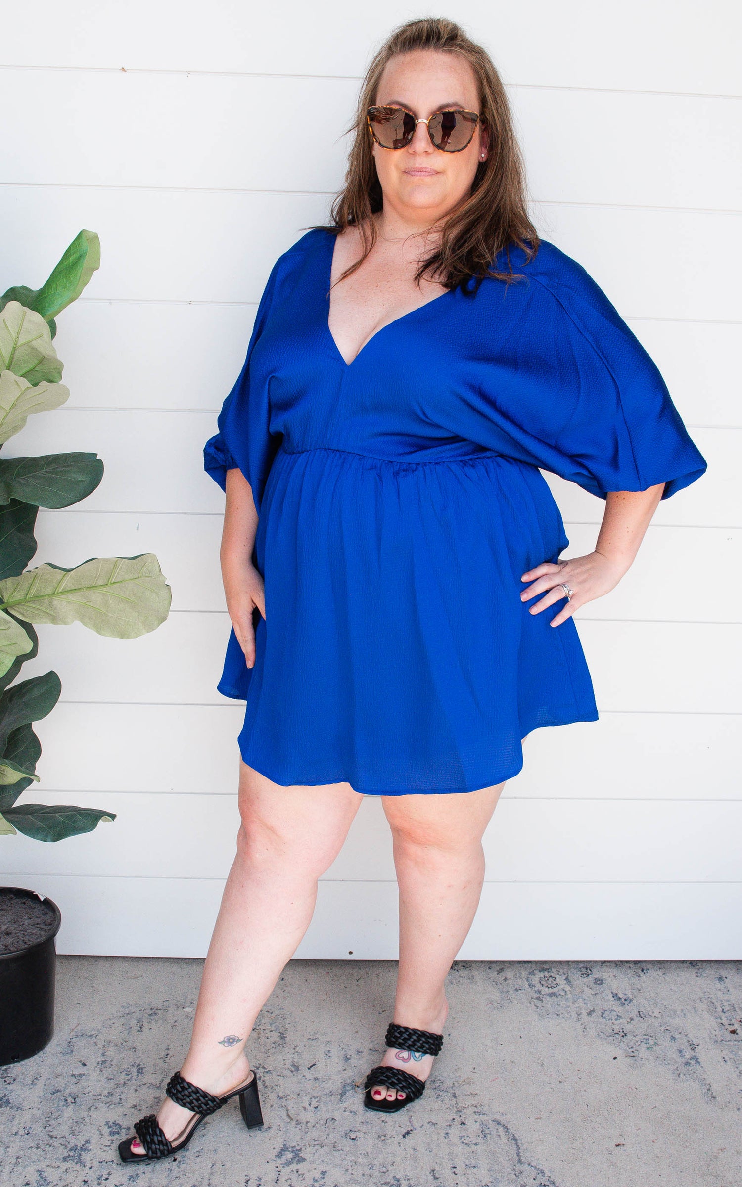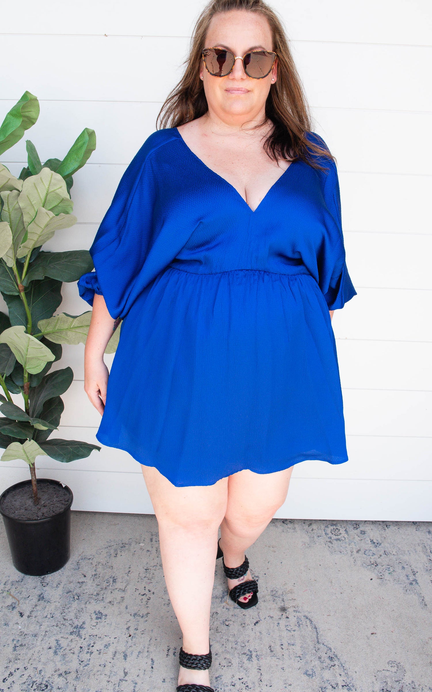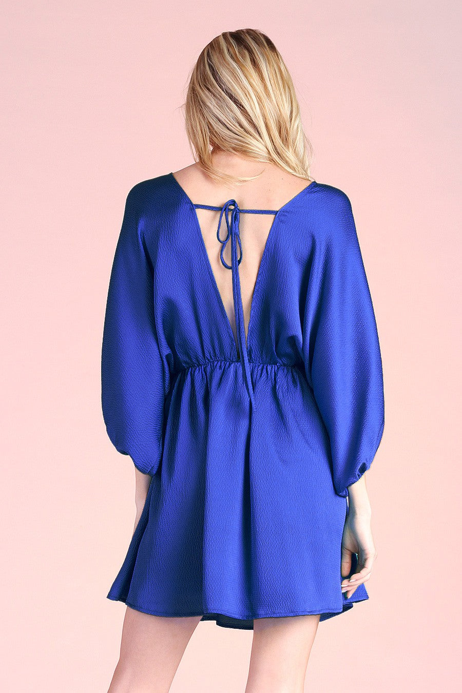 Effortless, comfortable, chic. This Kimono-inspired mini dress features a timeless v neckline, open back with a tie closure ana oversized sleeves. We LOVE to wear this with heels and a small clutch.