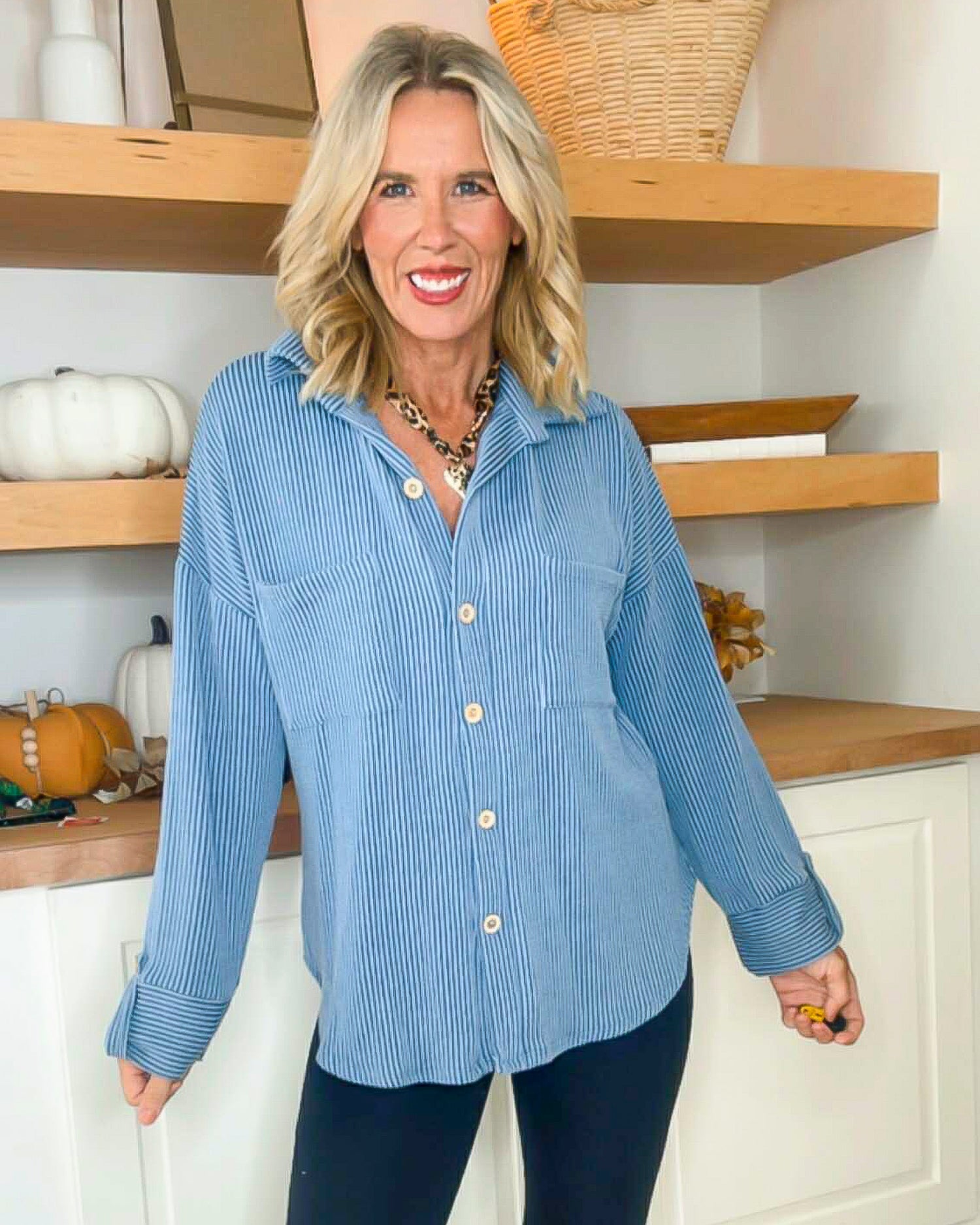 The Minas Ribbed Shacket is a perfect blend of a shirt and a jacket, designed for a comfortable and stylish layered look. Made from a soft, textured ribbed fabric, this piece features an oversized fit, classic collar, and button-front closure. It's a versatile and cozy addition to your wardrobe, complete with two front pockets for a functional and fashionable touch.