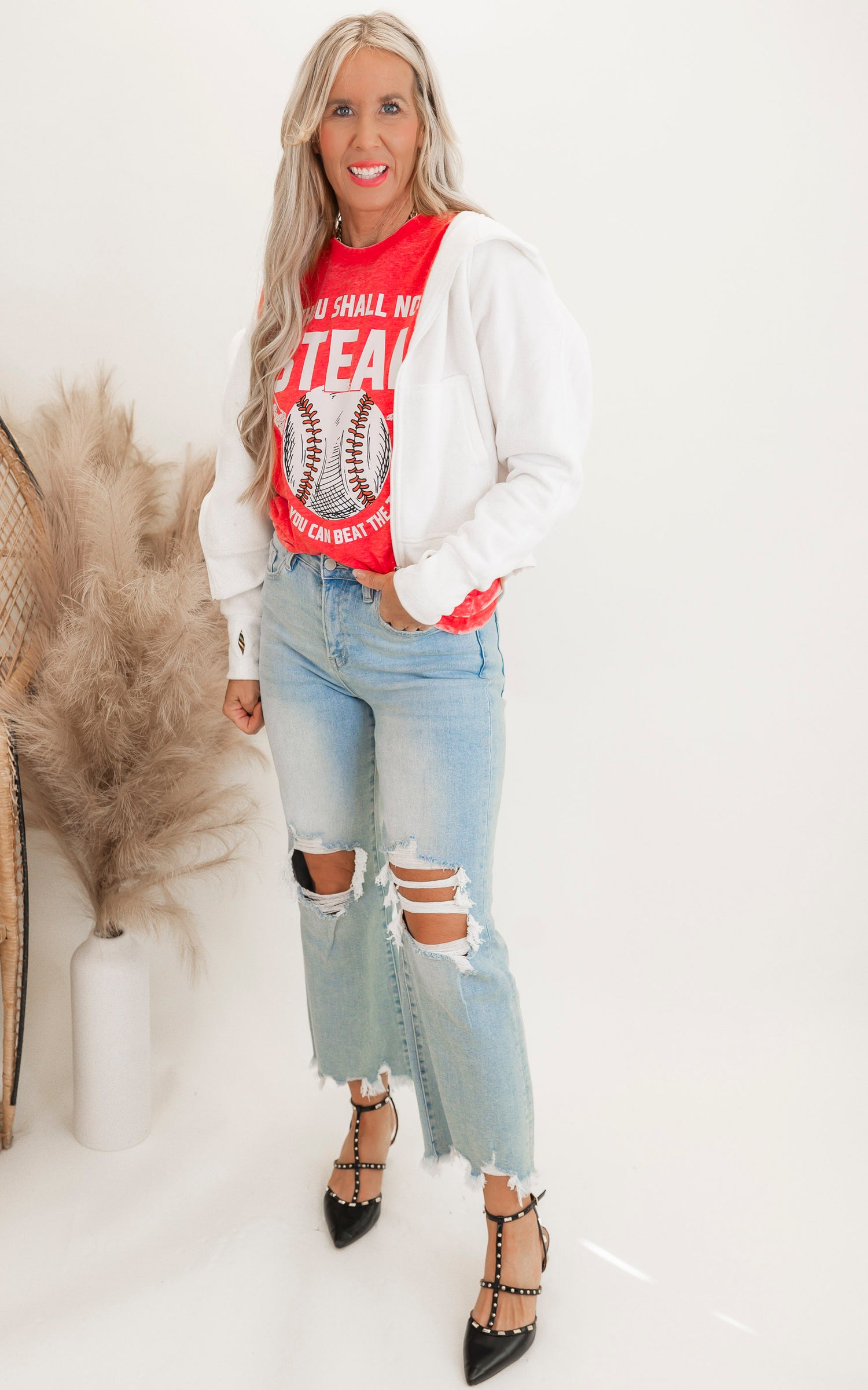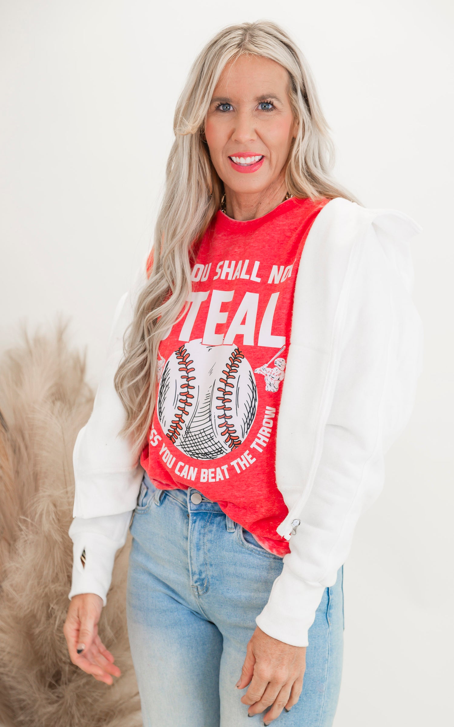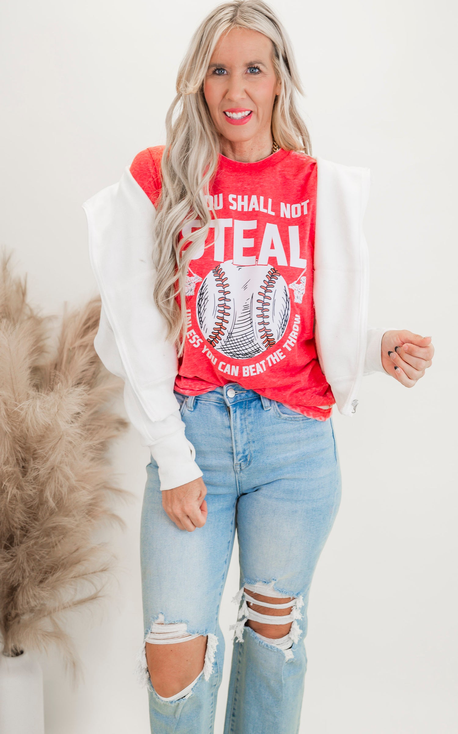 Inspire your inner baseball player with our "Thou Shall Not Steal" graphic t-shirt! This shirt boasts a bold design and a powerful message to remind you that stealing is never okay. Made with high-quality materials for maximum comfort and style, it's perfect for any casual outing. Show off your passion for the game and make a statement with this must-have t-shirt!