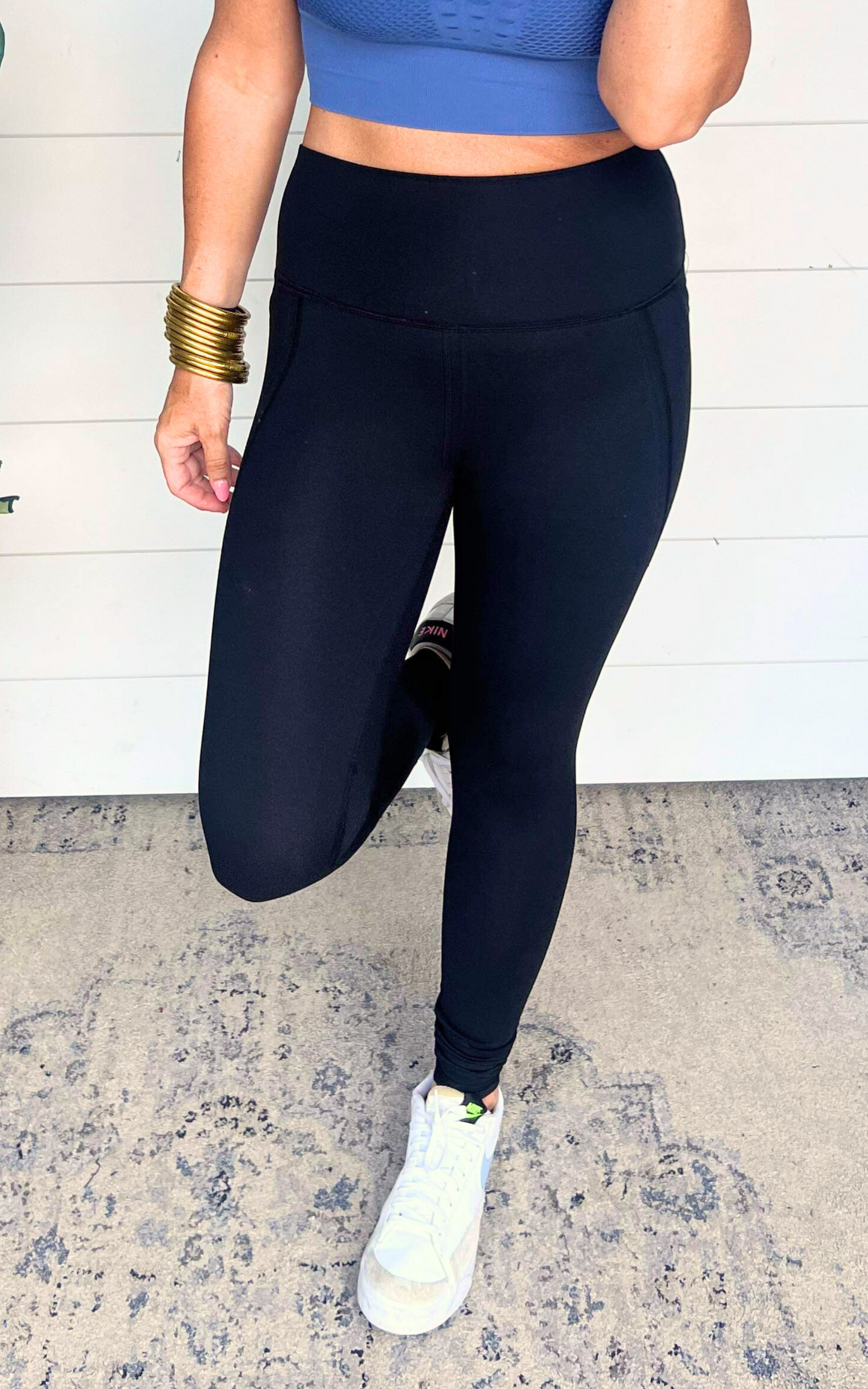 This pair of solid leggings comes with side pockets and no embellishment for a demure and versatile look. It features the new Mono B tapered waistband technology, meaning almost the same tummy-control effect, only with lesser restriction, allowing you to move with more freedom.