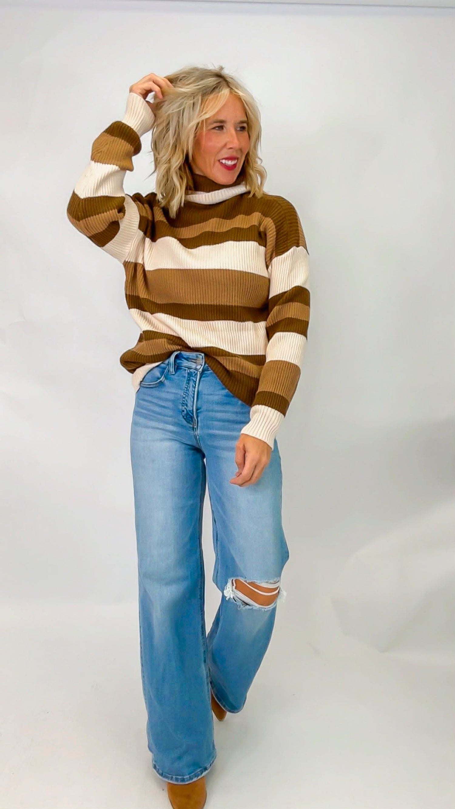 Cozy up in chic stripes with the Turtle Neck Striped Sweater Top—your go-to for cool weather style. Featuring a relaxed turtleneck and wide horizontal stripes in warm, neutral tones, this sweater balances timeless comfort with effortless sophistication.