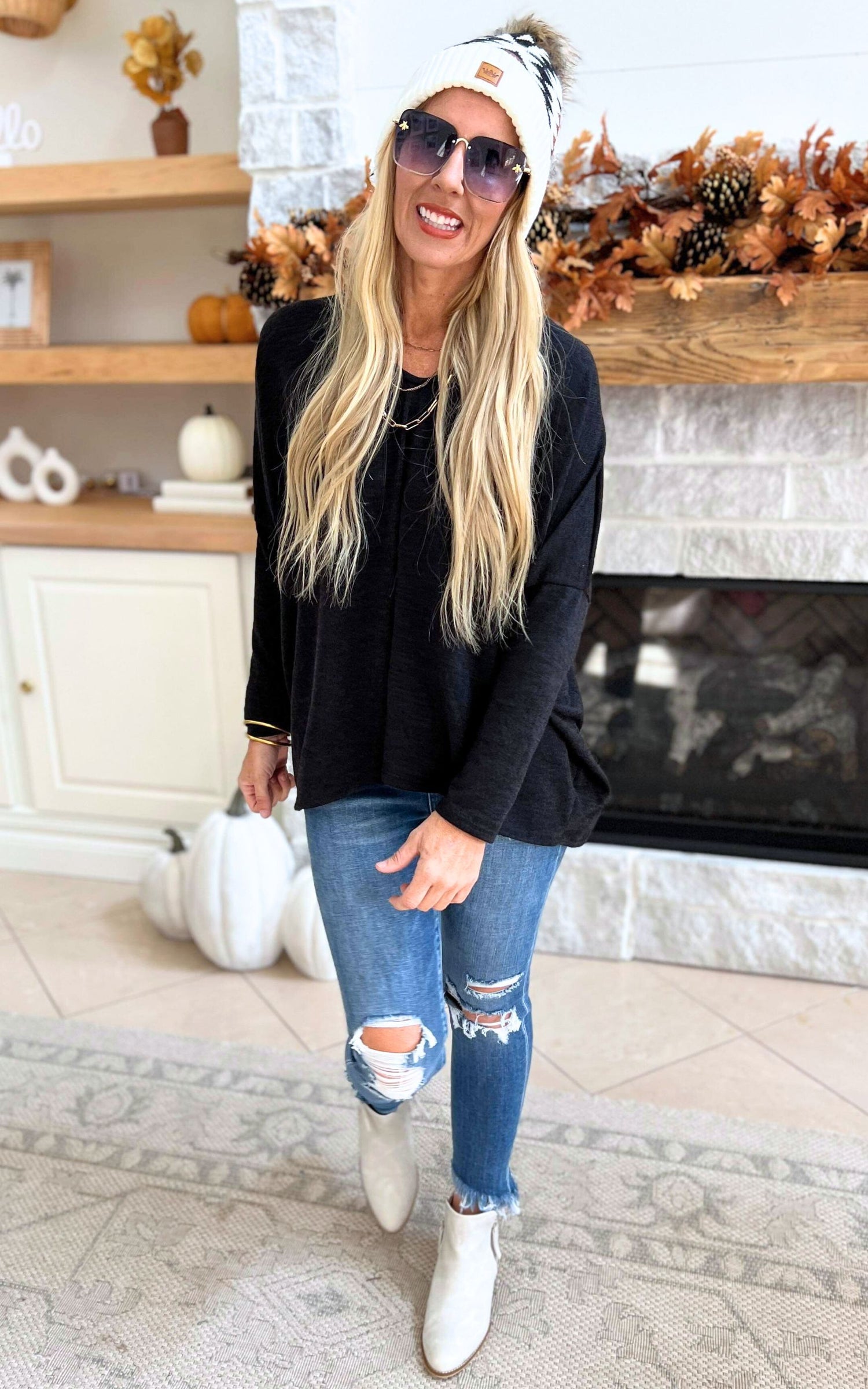 Stay cozy in this drop-shoulder V-neck top! The LONG SLEEVE and V NECK make this the perfect piece for elevated weekend vibes. Let your inner fashionista out today! (Let the good vibes roll!)
