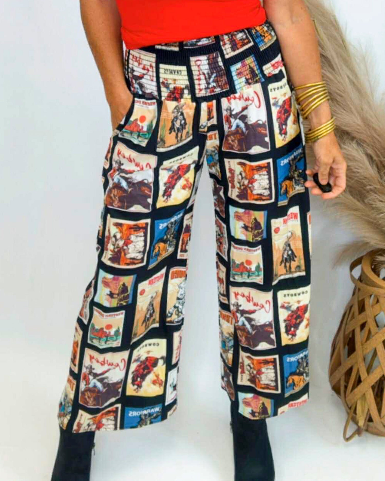Step into a playful twist on classic style with these Vintage Western Print Smock Waist Woven Pants. Featuring a comfortable smock waist for an easy fit and eye-catching western-inspired prints, they bring a fun, retro vibe to your everyday look. Perfect for adding a splash of personality while keeping things cozy and casual.
