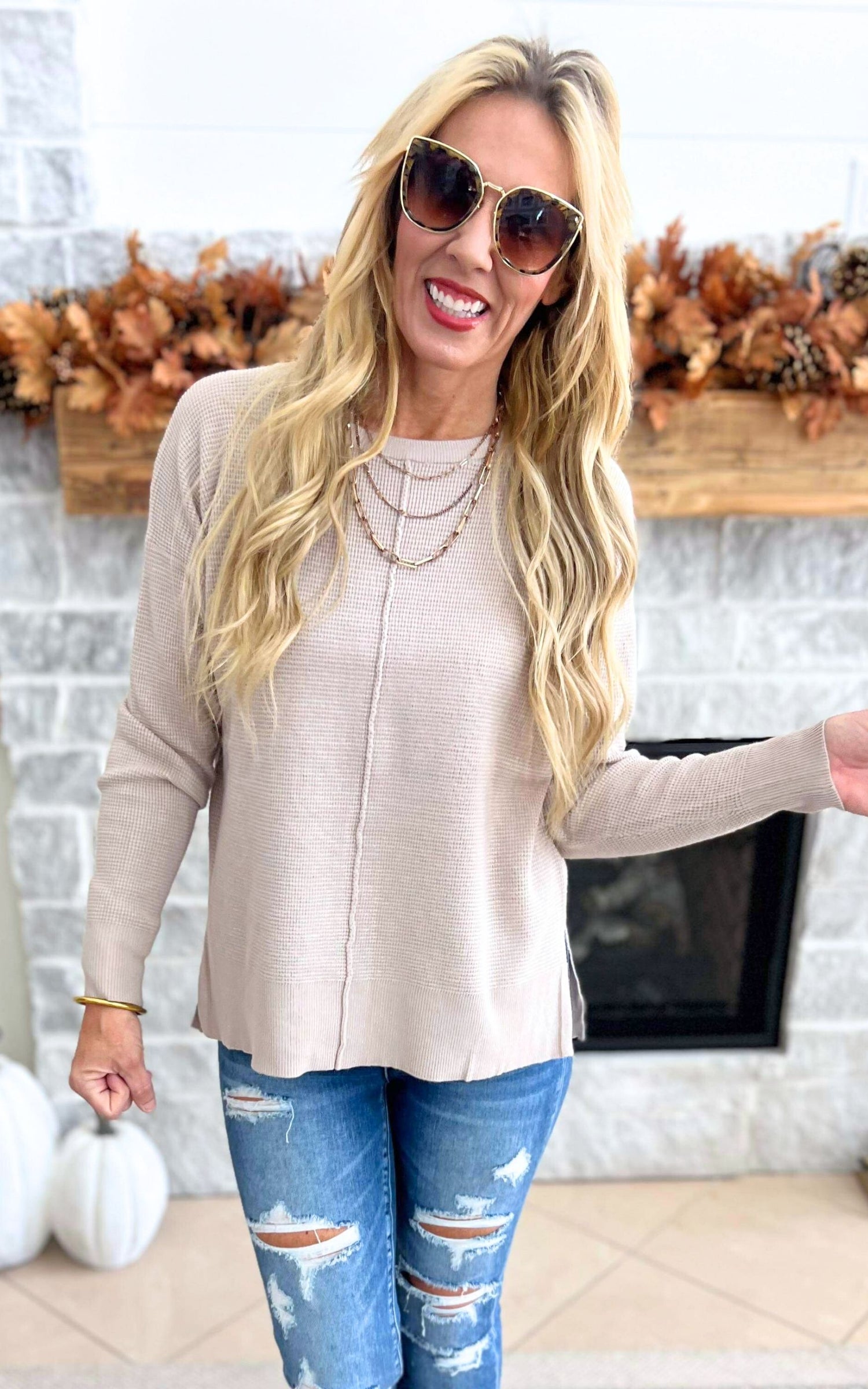 Stay warm and cozy in this stylish waffle crewneck pullover sweater. With a classic center-seamed design and long sleeves, you can enjoy all-day comfort and effortless style.