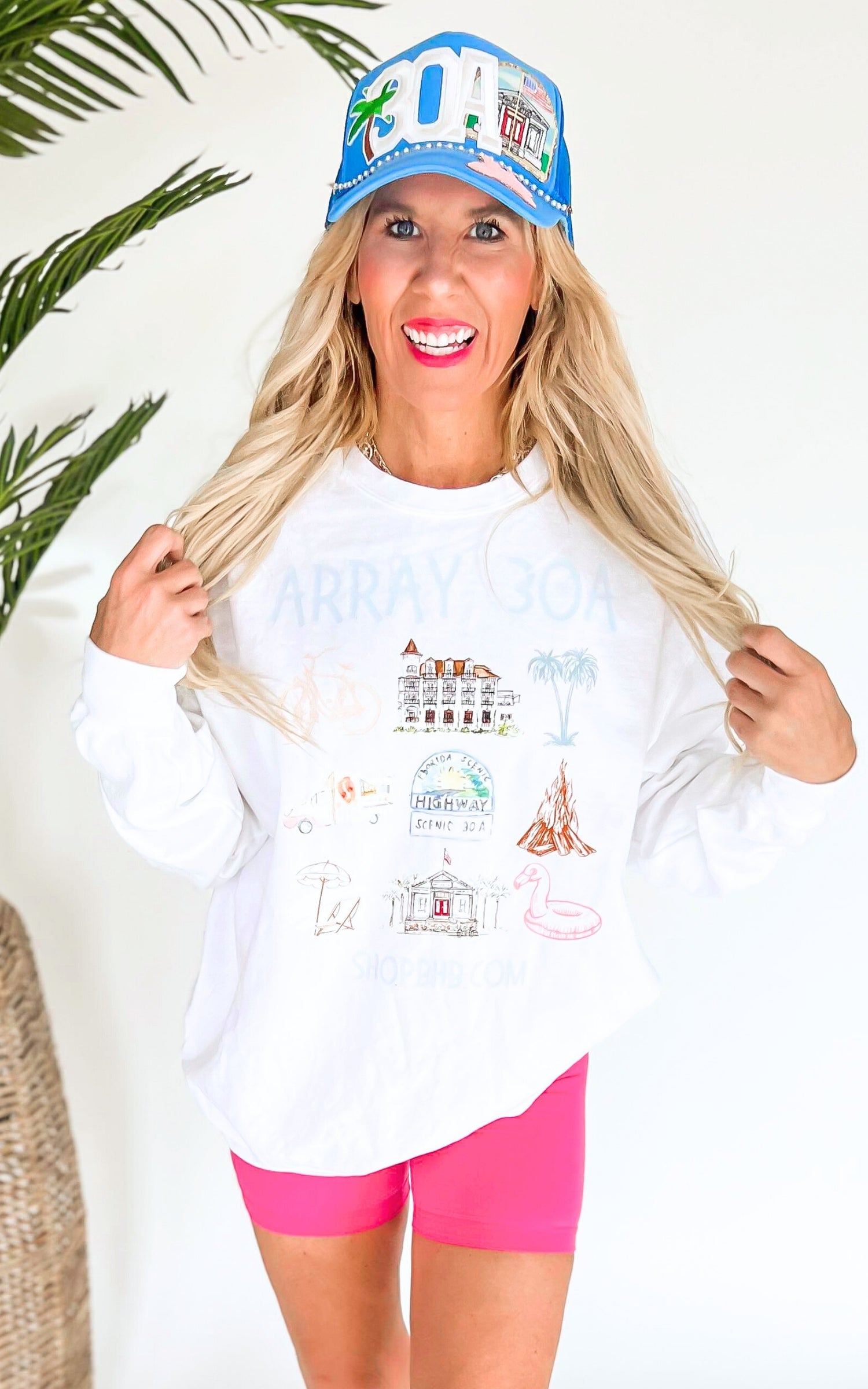 Stay cozy and stylish with our White 30A Array Graphic Crewneck Sweatshirt. Featuring a unique white graphic design that will make you stand out from the crowd. Perfect for everyday wear and layering on chilly days. Embrace your playful side with this comfy sweatshirt.