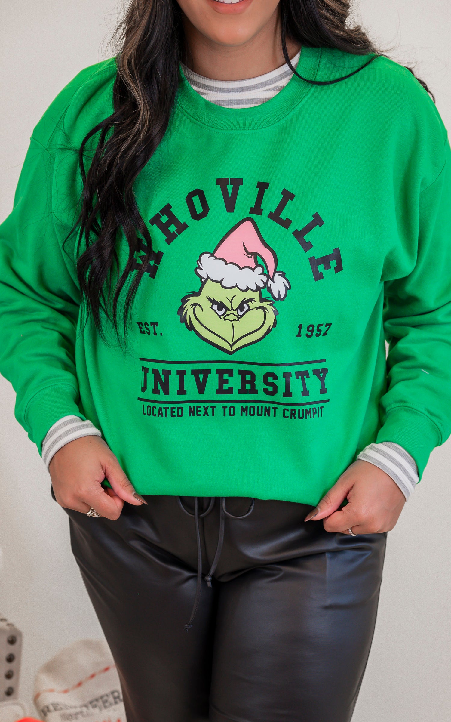 Become a proud member of Whoville University with our Graphic Crewneck Sweatshirt! Show off your school spirit and stay cozy with our comfortable and stylish design. Perfect for everyday wear or game days, this sweatshirt is a must-have for any Whoville student or fan. Join the Whoville community and represent your school with pride!