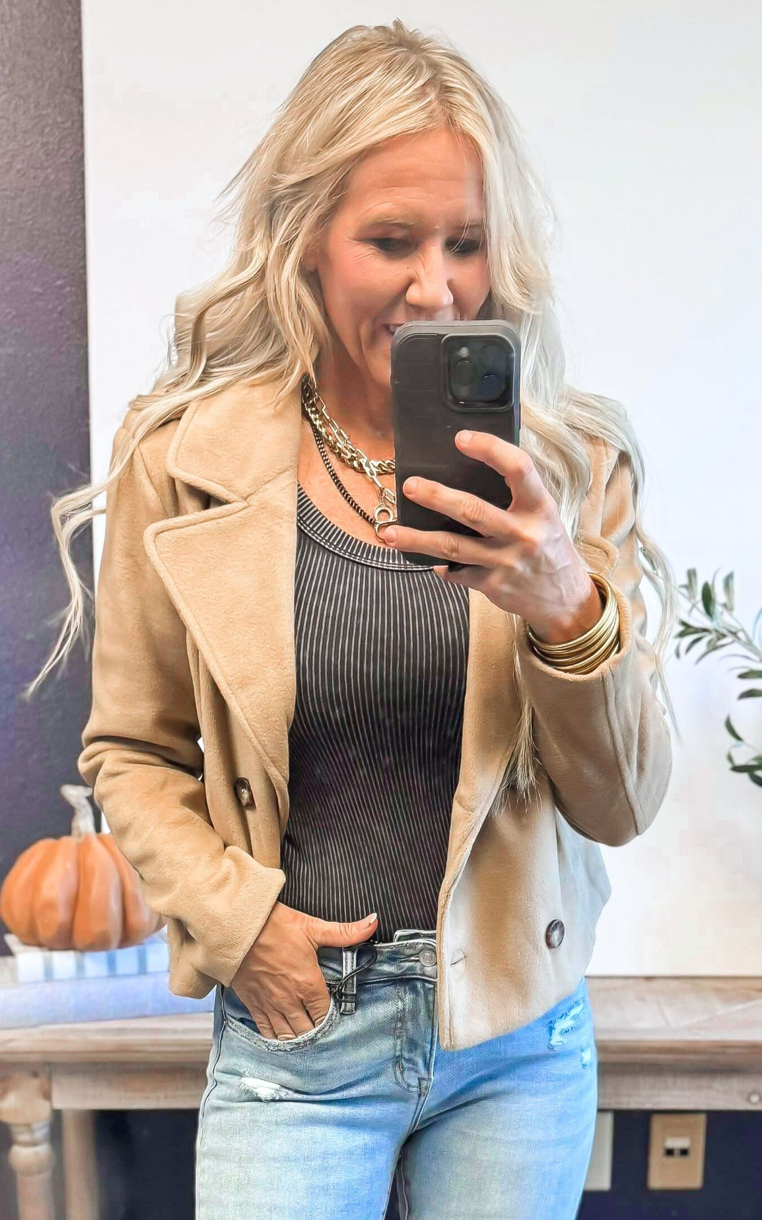 Wrap yourself in warmth and style with our Wool Like Double Breasted Crop Jacket. Made with a soft and cozy wool-like fabric, this jacket features a double-breasted design for a classic look. Perfect for chilly days, it's the must-have addition to your wardrobe.