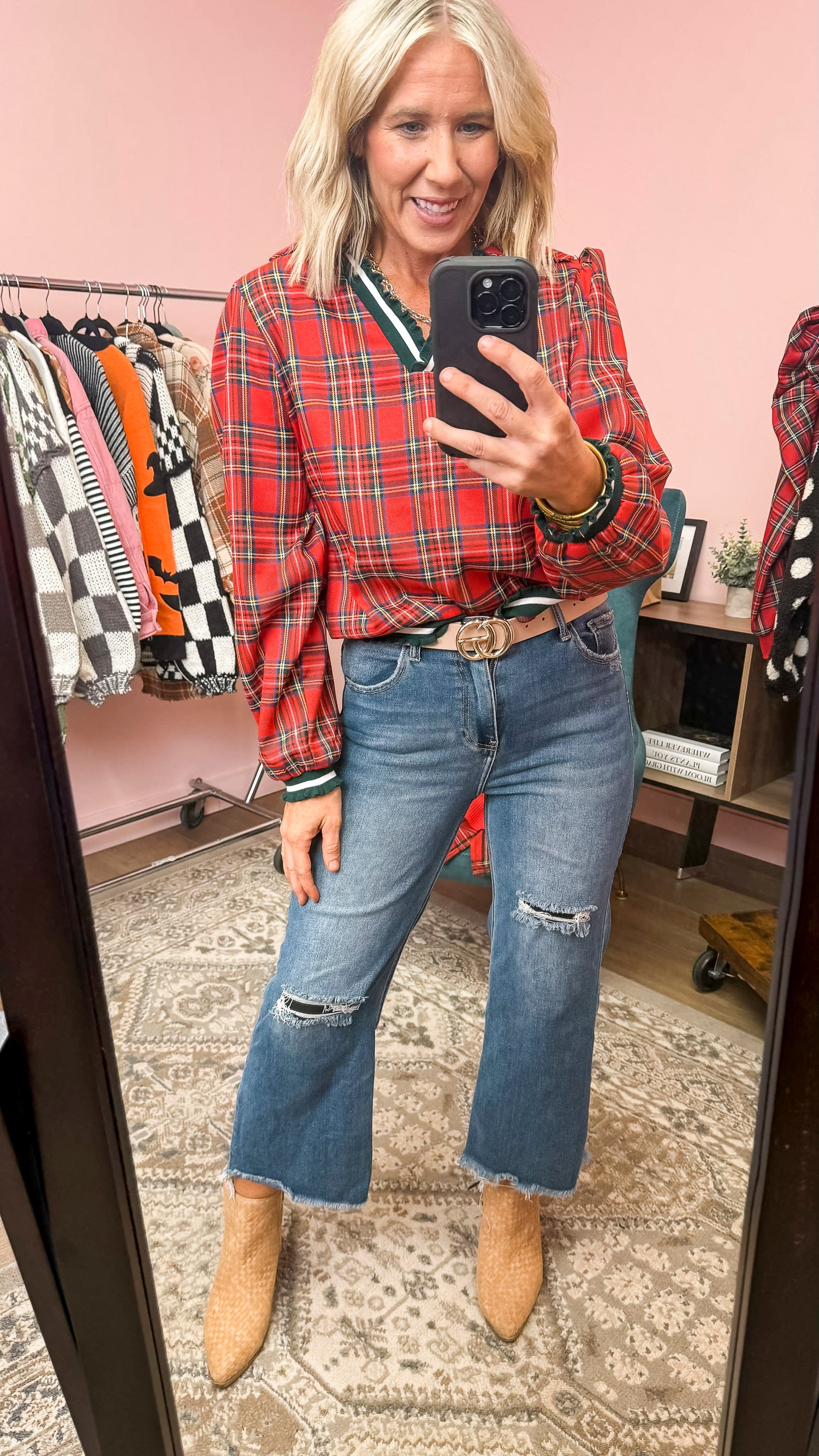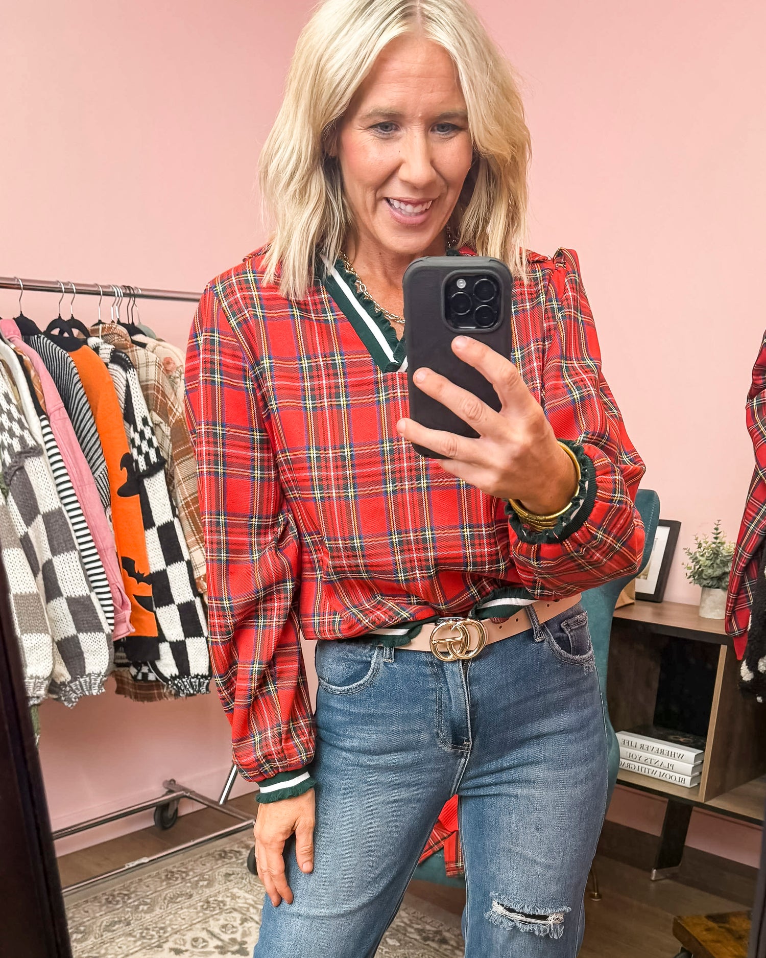 Christmas Plaid V Neck Collared Top | BIBI *LA LIVE PREORDER